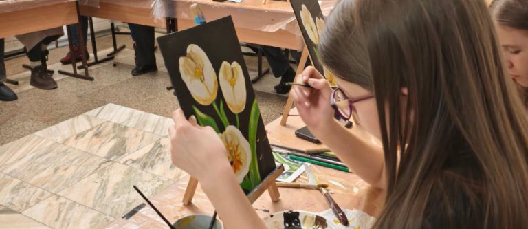 В фойе Дворца праздничное весеннее настроение будут создавать тематические фотозоны и выставка работ изостудии «Акварелька», на фоне которых можно сделать красивые памятные фотографии.