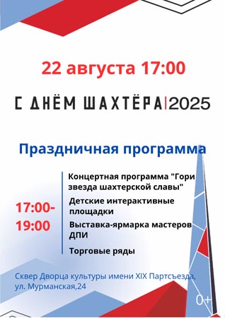 22 августа 2025 г. в 17:00 в парке возле Дворца культуры им. XIX Партсъезда МАУ «МКДК Орджоникидзевского района» по адресу ул. Мурманская, 24 состоится праздничная концертная программа «Гори звезда шахтерской славы».