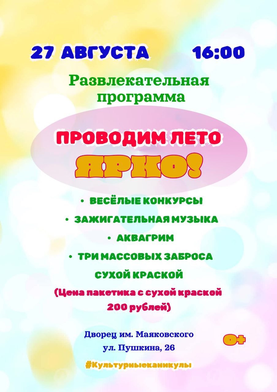 27 августа в 16:00 на площади возле Дворца имени Маяковского (ул. Пушкина, 26) состоится развлекательная программа «Проводим лето ярко!».
