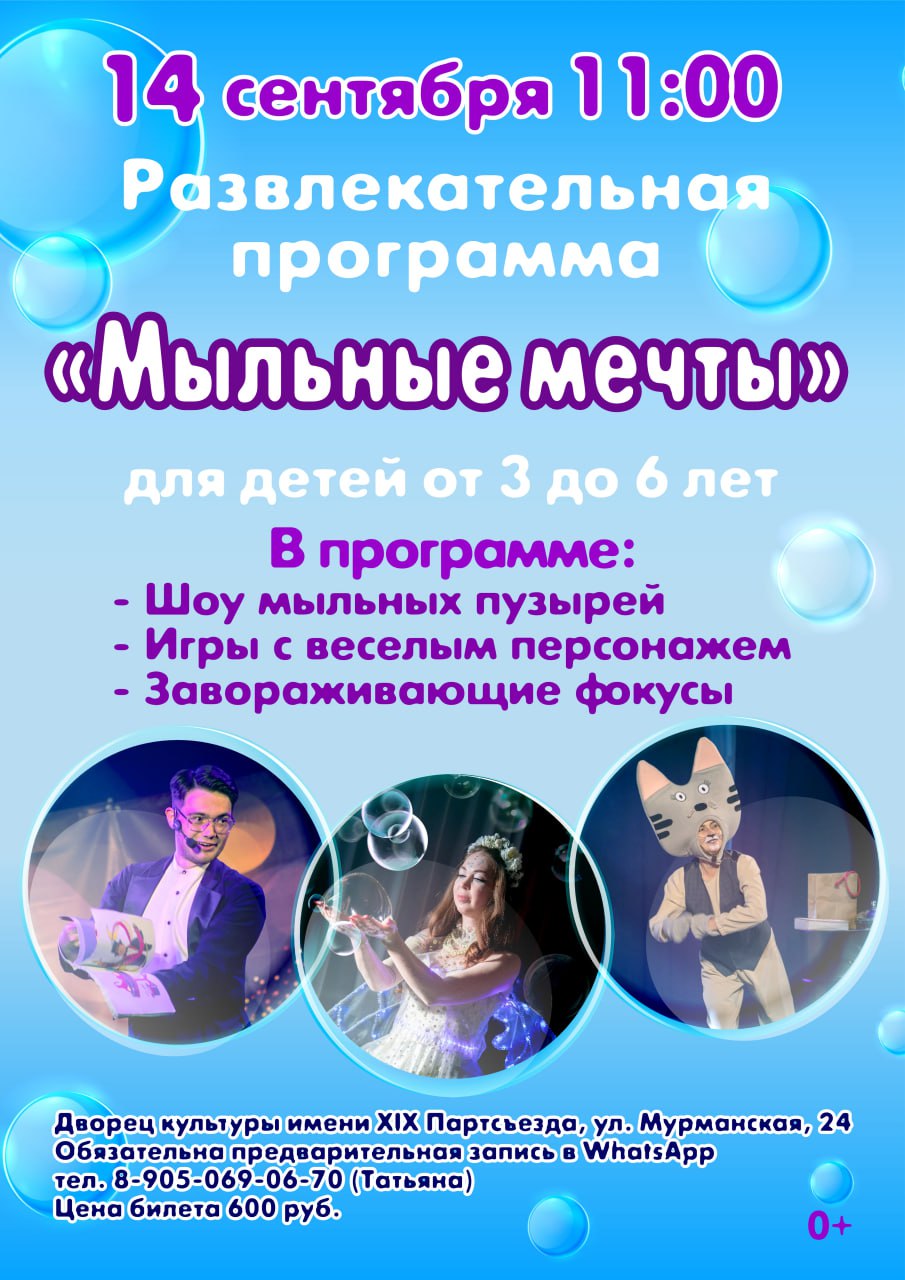 14.09.2025г. в 11:00 в МАУ «МКДК Орджоникидзевского района», СП Дворец культуры имени XIX Партсъезда, ул. Мурманская, 24, состоится развлекательная программа «Мыльные мечты».