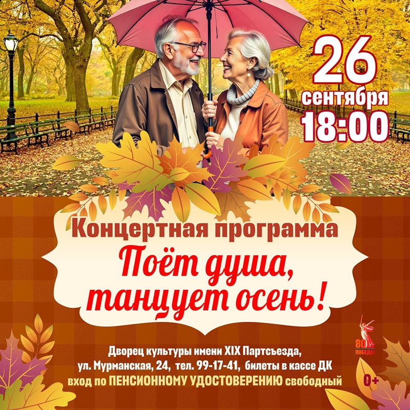 26.09.2025г. в 18:00 в МАУ «МКДК Орджоникидзевского района», СП ДК им. XIX Партсъезда, ул. Мурманская, 24, состоится концертная программа «Поёт душа, танцует осень!», посвященная Дню уважения старшего поколения.