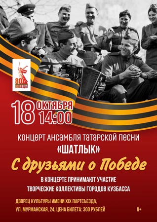 18.10.2025г. в 14:00 в МАУ «МКДК Орджоникидзевского района», СП ДК им. XIX Партсъезда, ул. Мурманская, 24 состоится концерт ансамбля татарской песни «Шатлык», «С друзьями о Победе».