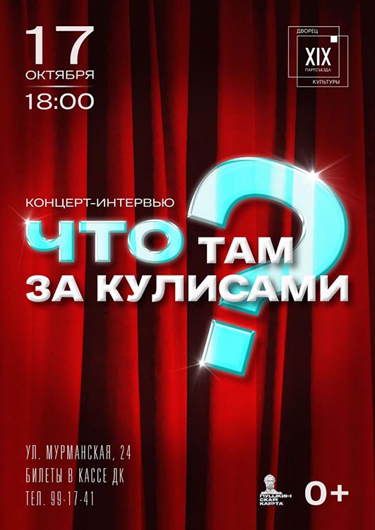 17.10.2025г. в 18:00 в МАУ «МКДК Орджоникидзевского района», СП ДК им. XIX Партсъезда, ул. Мурманская, 24, состоится концерт-интервью «Что там, за кулисами?», посвященный началу творческого сезона.