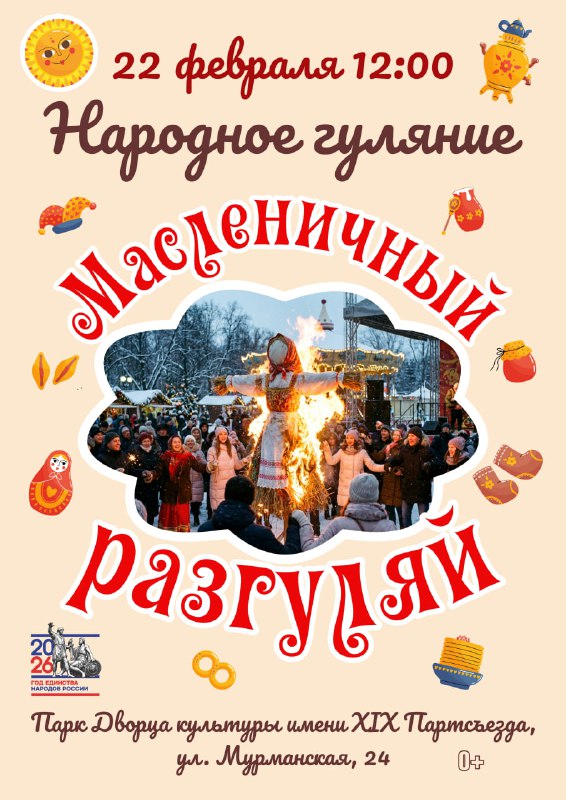 22.02.2026г. в 12:00 в парке Дворца культуры им. XIX Партсъезда, ул. Мурманская, 24 состоится народное гуляние «Масленичный разгуляй».