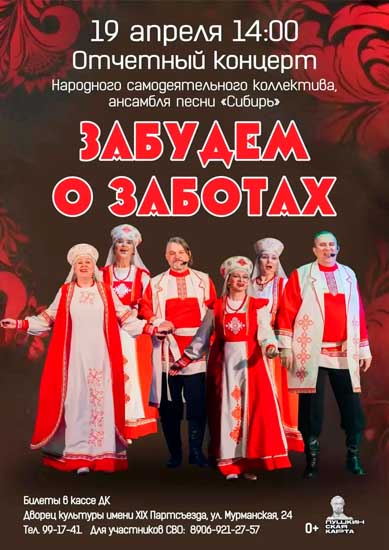 19.04.2026г. в 14:00 в МАУ «МКДК Орджоникидзевского района», СП ДК им. XIX Партсъезда, ул. Мурманская, 24, состоится отчетный концерт Народного самодеятельного коллектива, ансамбля песни «Забудем о заботах»