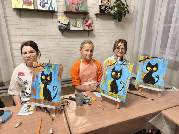 На мастер-классе «Осенний кот» собрались как дети, так и взрослые, и всем было очень интересно. Участники узнали о технике работы с мастихином, освоили приемы «набрызг» и «сухая кисть», а также научились смешивать новые цвета и оттенки. Каждый создал свою уникальную картину, полную творческой энергии. Все работы были неповторимыми и оригинальными.
