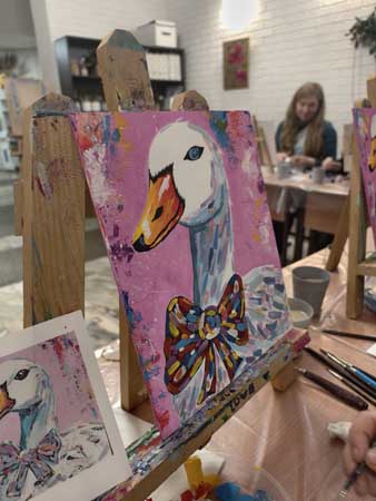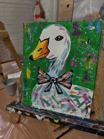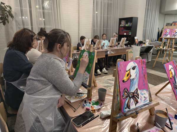 Это был удивительный мастер-класс, который собрал как детей, так и взрослых! Все погрузились в мир акриловой живописи и рисовали важного гуся. Каждый мог проявить свою фантазию, используя яркие краски и разные техники — от смелых мазков кистью и мастихином до забавного набрызга!