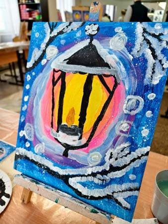 Дети погрузились в мир творчества, рисуя сказочный фонарь на заснеженном фоне. Они познакомились с техникой акриловой живописи, научились смешивать цвета, освоили различные приемы работы кистью и краской.