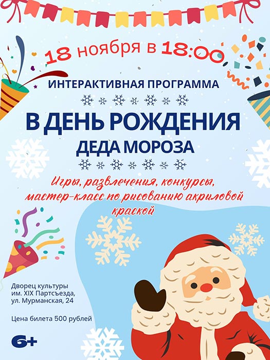 18.11.2025г. в 18:00 в МАУ «МКДК Орджоникидзевского района», СП Дворец культуры им. XIX Партсъезда, ул. Мурманская, 24 состоится интерактивная программа «В день рождения Деда Мороза».