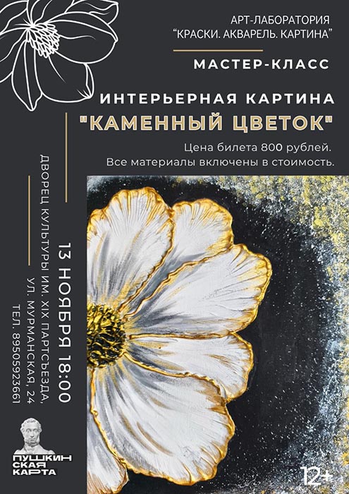13.11.2025г. в 18:00 в МАУ «МКДК Орджоникидзевского района», СП ДК им. XIX Партсъезда, ул. Мурманская, 24, состоится мастер-класс «Интерьерная картина «Каменный цветок»» в рамках арт-лаборатории «Краски. Акварель. Картина».