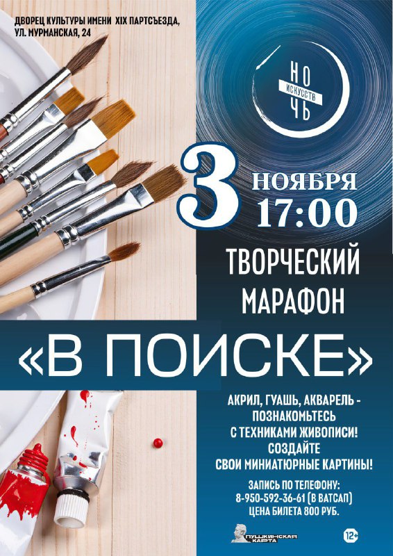 03.11.2025г. в 17:00 в МАУ «МКДК Орджоникидзевского района» СП Дворец культуры им. XIX Партсьезда, ул. Мурманская, 24 в рамках ежегодной акции «Ночь искусств» состоится творческий марафон «В поиске».