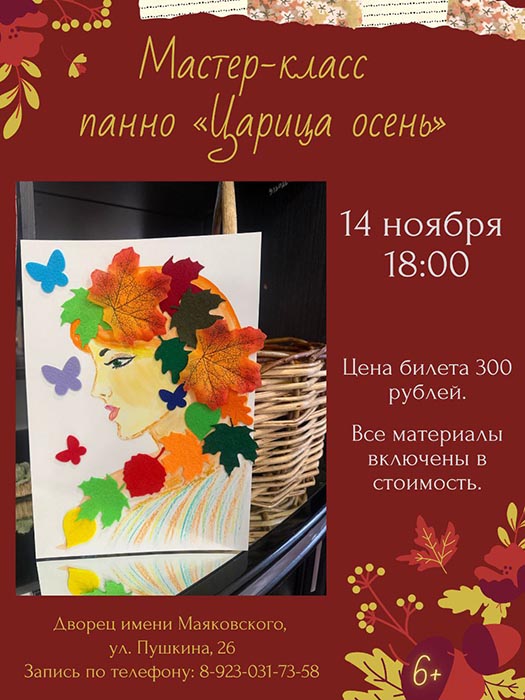 14 ноября в 18:00 в МАУ «МКДК Орджоникидзевского района» СП Дворец им. Маяковского по адресу ул. Пушкина, 26 состоится мастер-класс по созданию панно «Царица осень».