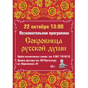 22.10.2025г. в 13:00 в МАУ «МКДК Орджоникидзевского района», СП Дворец культуры имени XIX Партсъезда, ул. Мурманская, 24, состоится познавательная программа «Сокровища русской души».