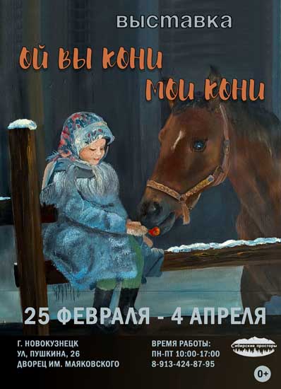 С 25 февраля по 04 апреля, в МАУ «МКДК Орджоникидзевского района», СП Дворец имени Маяковского, ул. Пушкина, 26 будет работать выставка «Ой вы кони, мои кони», которую представляет объединение свободных художников «Сибирские просторы».
