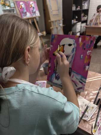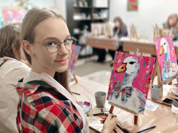 Это был удивительный мастер-класс, который собрал как детей, так и взрослых! Все погрузились в мир акриловой живописи и рисовали важного гуся. Каждый мог проявить свою фантазию, используя яркие краски и разные техники — от смелых мазков кистью и мастихином до забавного набрызга!