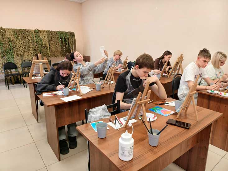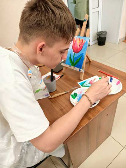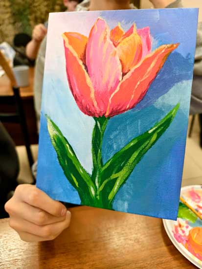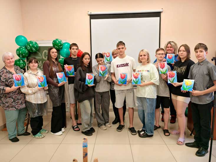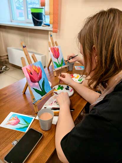 Юноши и девушки познакомились с техникой акриловой живописи и выполнили картину с изображением тюльпана. И хотя в начале занятия они сомневались в своих талантах, в итоге все создали потрясающие картины.