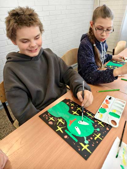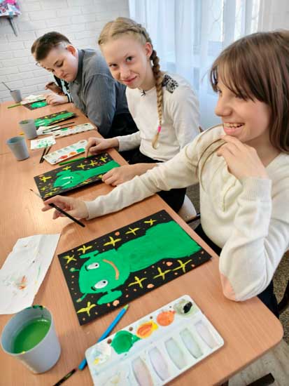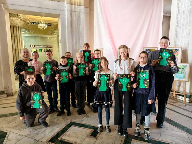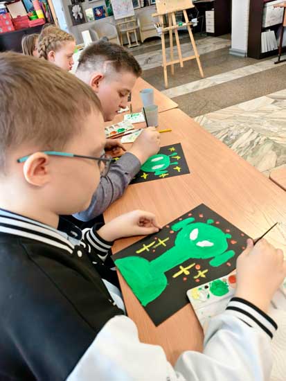 Сначала ребята посетили выставку рисунков о космосе и, вдохновившись, нарисовали своих забавных инопланетян на фоне ярких звёзд! У каждого получился уникальный «зелёный пришелец».